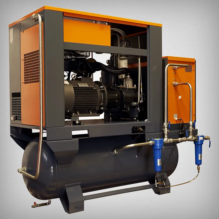 The G2DB-FF Series screw compressors provide a comprehensive solution for compressed air requirements, integrating essential components such as the dryer, tank, and screw elements into a seamless modular design.